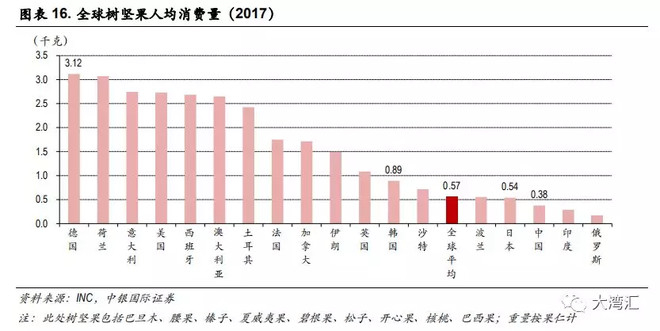 3.人均坚果消费量距离发达国家仍有2-3倍空间。
