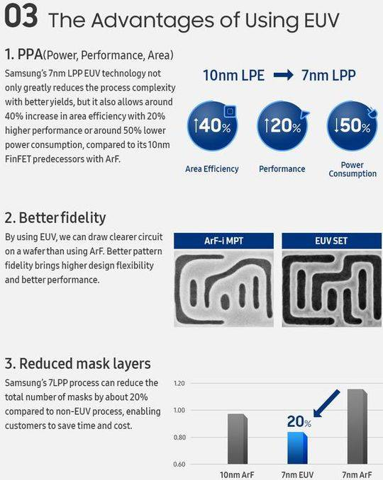 雷锋网了解到,三星在2018年4月才宣布完成7nm新工艺的研发,随后在2018年10月18日的SamsungTechDay上,三星宣布7LPP工艺进入量产;值得一提的是,三星在7nm技术上跳过了DUV阶段而直接进入EUV技术,并宣布基于EUV光刻技术的7LPP工艺对比现有的10nmFinFET工艺,可以提高20%性能、降低50%功耗、提升40%面积能效。