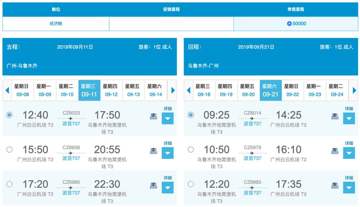 这趟航班实际上是从广州出发的,如果你和我一样住在珠三角,还要考虑从这里飞去遥远的乌鲁木齐,经济舱往返里程票需要50,000里程,商务舱往返则需要100,000里程了,真的还挺贵的。