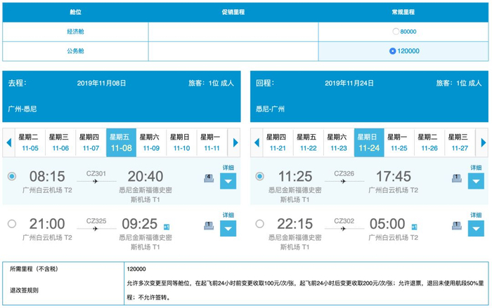 广州往返悉尼的商务舱,澳洲刚刚入夏,120,000南航里程+税费,随手查都有票,想要多换几张的话得多花点时间。