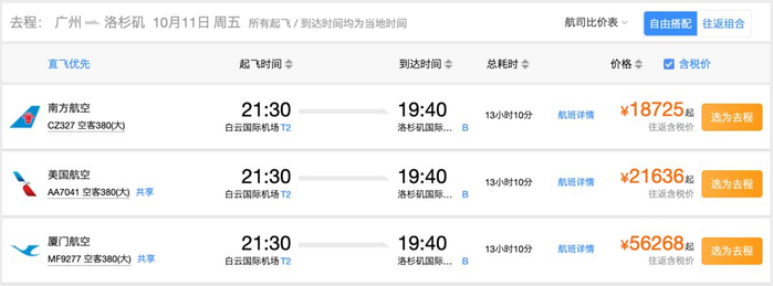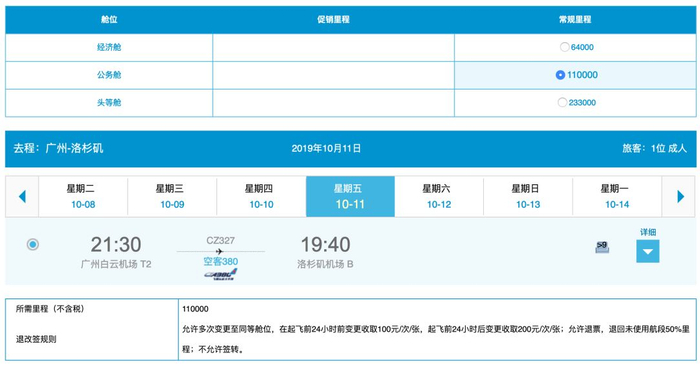 最后再来看看最远的北美,广州-洛杉矶,A380执飞,单程商务舱110,000里程,对于大户而言也算划算吧,毕竟拿去卖也就6,000块。去程商务舱的位置不少,但回程会有点难还,因为很多珠三角去洛杉矶生孩子的人会选择这趟航班躺回国。