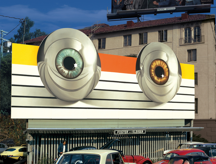 “这是我最喜欢的一幅。它的灵感来源于谁人乐队的摇滚歌剧《托米》,这是一部关于又聋又盲的弹子球天才的作品。考虑到这是一种商业媒体,但这些广告牌并不那么商业化。在很多例子中,甚至都没有提示你所售物为何的文字。或许只有少数人能理解,这两个眼球,代表的是长了眼睛的镀铬弹子球。”
