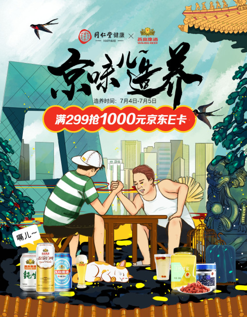 北京同仁堂健康正是因为这样的契机,加上最近90后的养生登上了微博的热搜榜单,想到了同是老北京的两个品牌是不是能碰撞出一些不一样的火花?当80后们在努力让自己不要成为中年油腻男女时,危机感重重的90后已经开始走上养生朋克之路。他们孜孜不倦地熬夜,又勤勤恳恳地养生护肤,被网友戏称为养生朋克,北京同仁堂健康与燕京啤酒组了这样一对CP,京东首发两大京牌大咖国潮跨界,刮起了一股京味儿造养风。