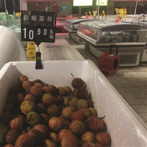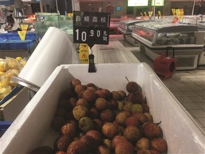 记者在南京市鼓楼区宁海路上的一家水果大卖场看到,最便宜的白糖罂荔枝每斤售价18.8元,而荔枝王与桂味两个品种的荔枝,每斤售价都达到了48元。记者走访的几家超市水果店,售价最低的是河西一家家乐福的白蜡荔枝,每斤只要10.9元,不过荔枝明显已经不新鲜,是降价处理。