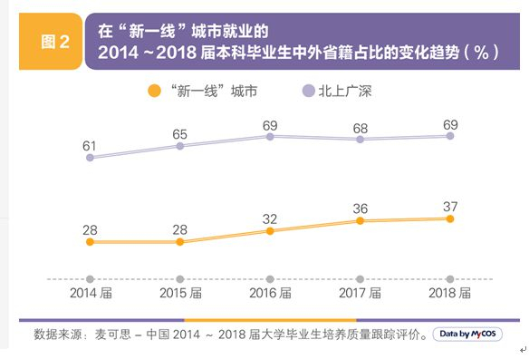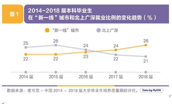 与之相似,麦可思7月4日发布的报告也显示,近年来应届本科毕业生在“新一线”城市就业的比例从2014届的22%上升到了2018届的26%,在“北上广深”就业的比例从2014届的25%下降到了2018届的21%。