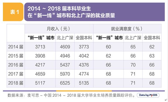 2018届本科毕业生在“新一线”城市的月收入(5117元)比2017届(4659元)增长了458元,比2016届(4217元)增长了900元。2018届本科毕业生在“新一线”城市的就业满意度为68%,与2017届(68%)持平,比2016届(66%)高2个百分点。