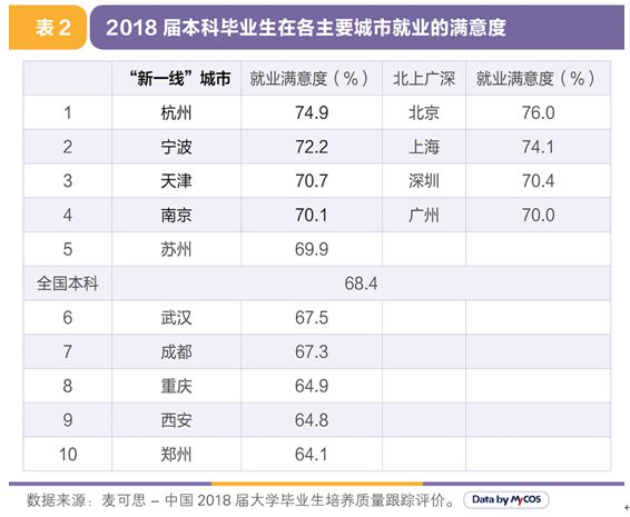 需指出的是,虽然2018届本科毕业生在“新一线”城市的就业满意度略低于一线城市(71%),但从近五届数据来看差值在缩小。在2018届本科毕业生就业数量最大的前10个“新一线”城市中[w1],在杭州、宁波、天津、南京就业的就业满意度较高,不输于一线城市。