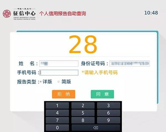 第三步,人脸比对通过后,输入手机号码,然后可以选择你需要打印的报告类型,有详细版和简版。同意后,页面将显示报告信息,并完成打印,此时系统会提醒你取走报告,并收好身份证。