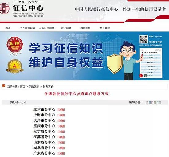 可以发现,征信中心公布了全国各征信分中心的相关信息,点击分中心名称后的红字“详细”,即可看到所有的具体查询网点。