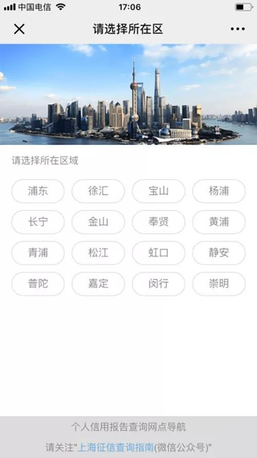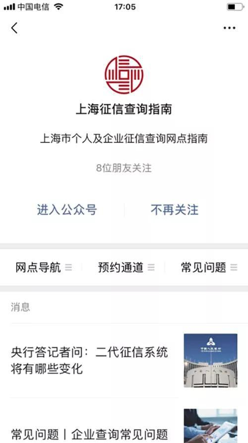 例如,你想查询关于上海市个人征信查询服务网点信息,可以关注微信公众号“上海征信查询指南”,在公号的菜单栏“网点导航”中选择所在区,查询具体的网点信息。