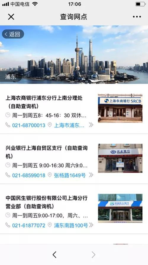 例如,选择“浦东”,就能看到浦东新区的所有提供征信查询服务网点的地址、营业时间、电话等信息。