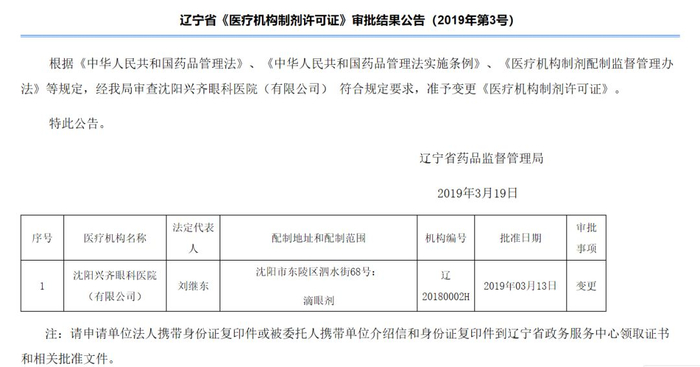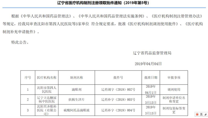 根据辽宁省药监局的公开信息,1月28日,该局批准沈阳兴齐眼科医院的硫酸阿托品滴眼液作为医疗机构制剂使用。医疗机构制剂俗称院内制剂,是指医疗机构根据本单位临床需要经批准而配制、自用的固定处方制剂。在严格的新药审批之外,允许由省级药监局审批院内制剂主要是为了解决临床急需的问题。