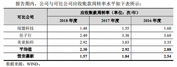 另外,在报告期内,恒安嘉新应收账款的周转率分别为2.54、1.84和1.57,呈逐年下降趋势,说明公司的资金使用效率不断下降。