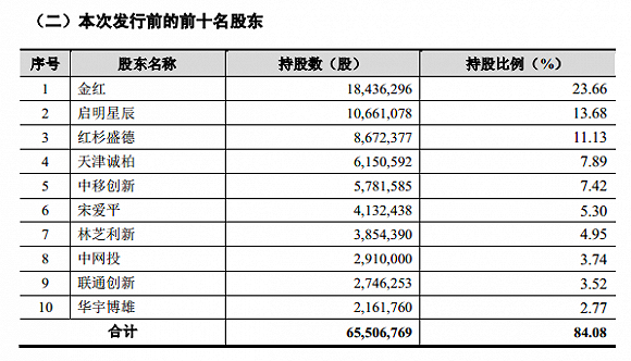 中移创新以578.16万股的持股量,位列发行前第五股东。从公开信息看,中移创新归中国移动旗下,中国移动持股50%。另外中国移动还通过中国互联网投资基金(有限合伙)(下称中网投)间接持有恒安嘉新股份,中国移动最终间接持股322.58万股,占恒安嘉新发行前总股本比例4.14%。
