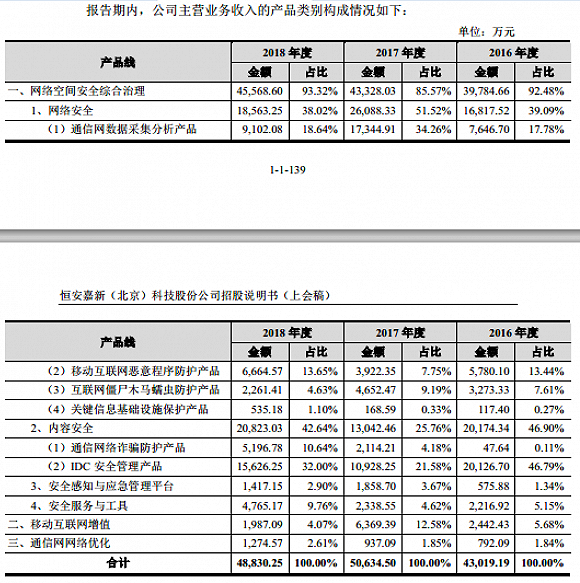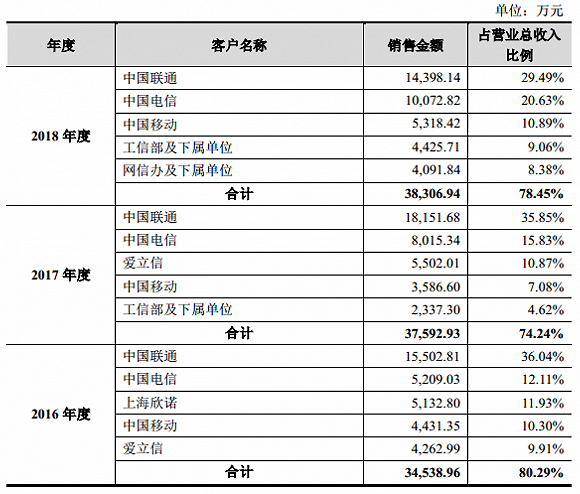 从数据看,2018年三大运营商占据恒安嘉新前三客户席位,外加工信部及下属单位,以及网信办及下属单位,前五客户实现收入3.83亿元,占到了营业总收入的78.45%,且这个数据在最近三年里都始终高企。