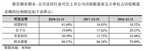 从目前来看,恒安嘉新对前五大客户的依赖程度非常高。2016年度至2018年度,公司对前五名客户的销售额占公司营业收入的比例分别为80.29%、74.24%、78.45%。客户集中度较高,具有一定的客户集中风险。对此,恒安嘉新也提示过风险,称“如果其中某一客户由于国家政策的调整、宏观经济形势变化或自身经营状况不佳而导致对公司产品的采购需求或付款能力降低,则可能导致公司无法获得相应订单,从而对公司的生产经营产生不利影响”。