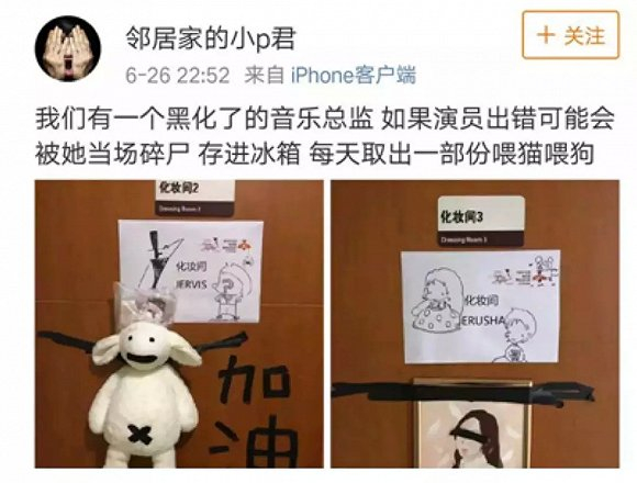6月26日晚,一位名为@“邻居家的小p君”的用户发了条微博:我们有一个黑化了的音乐总监,如果演员出错可能会被她当场碎尸,存进冰箱,每天取出一部分喂猫喂狗,并配了两张图。一张图中,一只玩偶被黑色胶布封了嘴,肚子上贴了叉,并被勒住脖子贴在了门上。另一张是一幅画中的女生被黑色胶布贴住了眼睛,画也被贴在了门上。