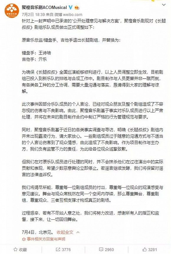 7月2日傍晚,@“聚橙音乐剧ACOMusical”官微发出一则针对音乐剧《长腿叔叔》剧组乐队成员的调整通知,原音乐总监/键盘手和吉他手都退出长腿剧组,换作他人。