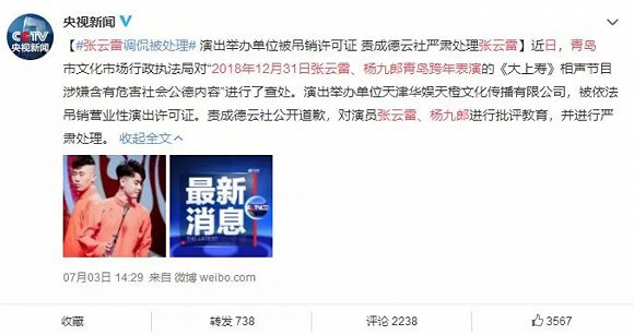 树大招风,张云雷去年的演出今年忽然被翻出、被处理,也就不难理解了。2018年底,张云雷和杨九郎在演出中有“大姐嫁唐山,二姐嫁汶川,三姐嫁玉树”,“三个姐姐多有造化,都是幸存者”的内容。该视频在今年6月忽然广泛传播并被网友声讨,最终因调侃汶川地震而受到青岛市文化市场行政执法局的处罚,不但他们被批评教育,演出承办单位天津华娱天橙文化传播有限公司也被吊销了营业性演出许可证,罚款50000元,德云社也要公开道歉。