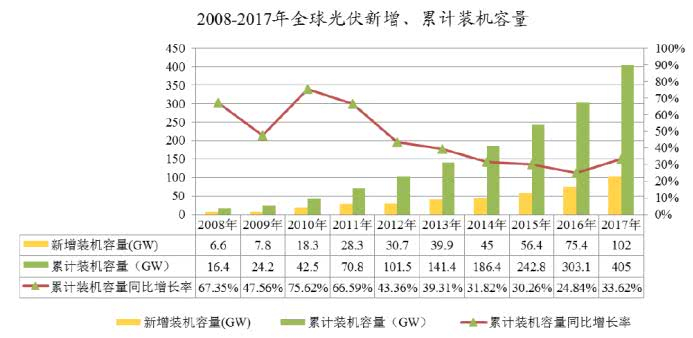多年以来,光伏行业增速非常可观,2007年,全球光伏累计装机容量仅为9.8GW,至2017年已累计达到405GW,较2016年增长幅度高达33.62%。