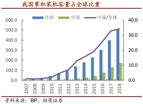 我国光伏产业虽然起步较晚但发展飞速,累积装机容量占全球装机容量的比重逐年提升,从2011到 2017年,累计装机年复合增长率高达 183%,目前已经是全球第一大光伏市场。
