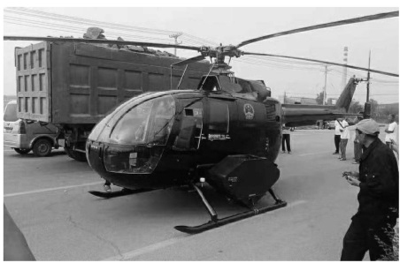目击者邵先生说,得知发生了此事后,他来到事故发生地点看见:在贾窑村东头庄稼地旁的乡间小路上停着一架直升机,飞机机身为墨绿色,飞机长约四米左右,机顶螺旋桨叶片有所缺失。飞机旁边停着一辆货车,该货车里有一个男子在现场看护。当时现场飞机驾驶室内无人,飞机机身前面部分用帆布遮挡着。