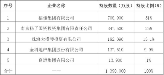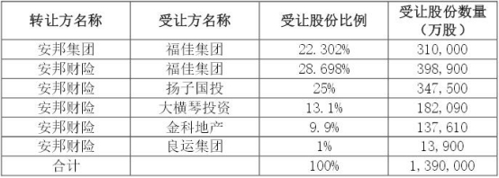 公告显示,安邦集团拟将22.302%股权转让给福佳集团,安邦财险转让28.698%给福佳集团。此外,安邦财险还将剩下的股权转让给扬子国投、大横琴投资、金科地产、良运集团4家公司,转让比例分别为25%、13.1%、9.9%、1%。