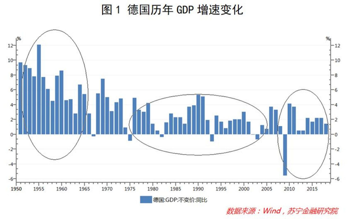 早在二战结束伊始,工业的迅速恢复让德国经济重振雄风。然而受20世纪70年代末开始的滞胀危机的影响,以及90年代初东德并入对宏观经济的冲击,德国经济增速下滑极为明显,而下行压力也与日俱增(参见图1)。增速的不断放缓,使得德国居民在日常消费上开始逐渐向理性回归,并越来越关注物美价廉的商品。