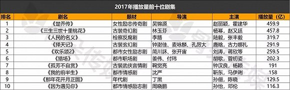 从上图可以看出,2017年播放量前十的作品,分别是《楚乔传》《三生三世十里桃花》《择天记》等,此外还有《孤芳不自赏》《那年花开月正圆》等作品都是“流量标配”剧。这些作品中《楚乔传》《三生三世十里桃花》两部作品的累计播放量最高,包括《那年花开月正圆》这部作品在内,展现的是“大女主”内核,以新女性精神贴合当下的社会思想。而豆瓣高分剧中男性硬核题材更多。除了社会话题剧之外,播放量并不算太高。