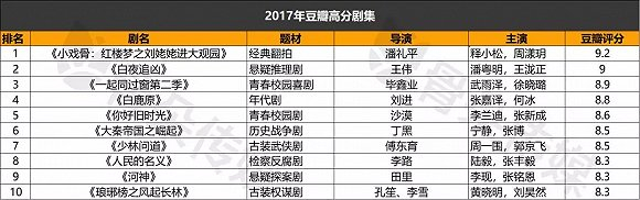 实际上,拿2017年剧集播放量前十作品和豆瓣口碑作品进行对比,就能发现一个有意思的现象:高分剧以男性向题材居多的时候,女性向剧集往往网络播放量进入市场头部,它们的热度一般高于这些剧集。