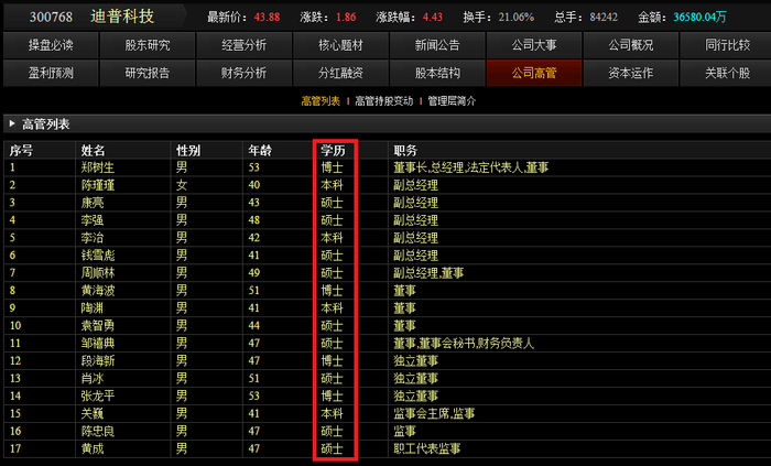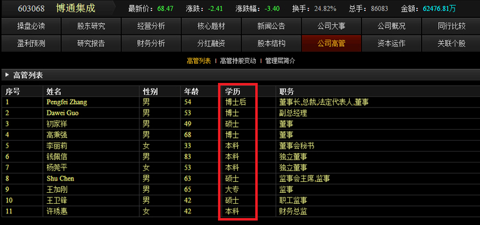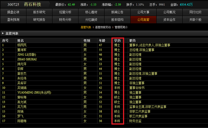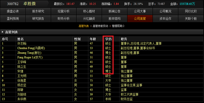 “高科技公司”当然需要强大的智囊团来支撑,而公司的核心高管如果学历清一色地都是高知分子的话,这家研究型技术公司就更加靠谱。比如下面几个例子,大家注意看学历一栏。