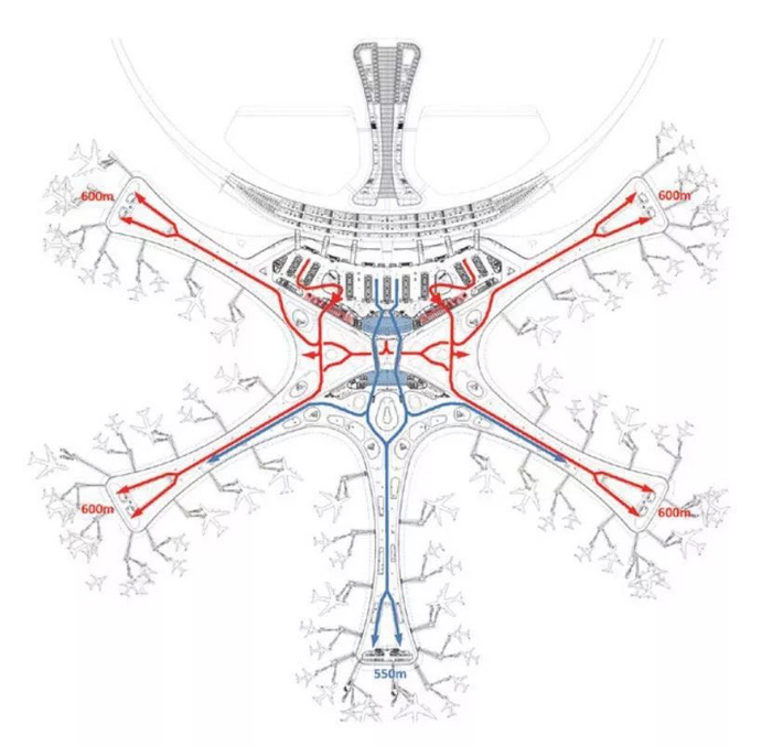 在大兴机场之前,国内所有机场均采用平行或垂直指廊设计。旅客吞吐量大的大型机场自然远机位就多,人们前往登机口的步行距离也长。放射型指廊造型,便可以大大缩短人们在机场内的步行距离。大兴机场最终设计了6条指廊、每条指廊间呈60度夹角的构型。其中,5条指廊为登机指廊,长度仅为600米,步行到达最远机位仅需8分钟。还有一条指廊连接工作和服务区,设有酒店等服务设施。