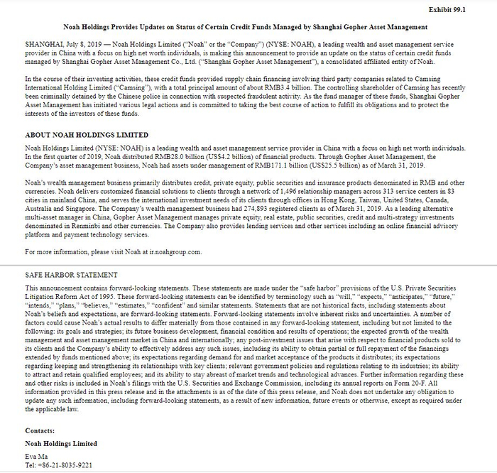 事后,诺亚财富方面对外界表示,关于诺亚旗下上海歌斐资产管理的创世核心企业私募基金延期事件,公司已于7月8日19点(北京时间)发布官方声明,发现该项目风险因素后,立即启动了对存续期内其它产品的深度排查,截至目前并未发现同类问题(截至 2019年第一季度,歌斐管理基金总额为1711亿,产品数量共计800余支)。诺亚财富将积极配合警方调查,尽全力推进事件解决。