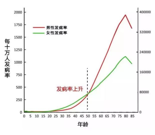 根据《中国人身保险业重大疾病经验发生率表(2006-2010)》,不论男性还是女性,年龄越大发病率越高(80岁左右开始下滑是受到平均寿命的影响)。