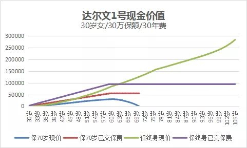 30岁女性30万保额,30年下来,保终身比保70岁只多交了38970元。