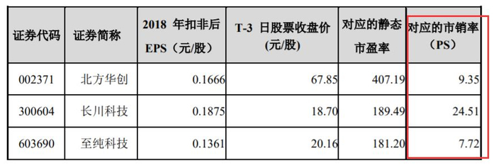 值一提的是,在与行业市盈率和可比上市公司估值水平比较时,首次出现PS(市销率)估值法,中微公司选取PE和PS进行比较。