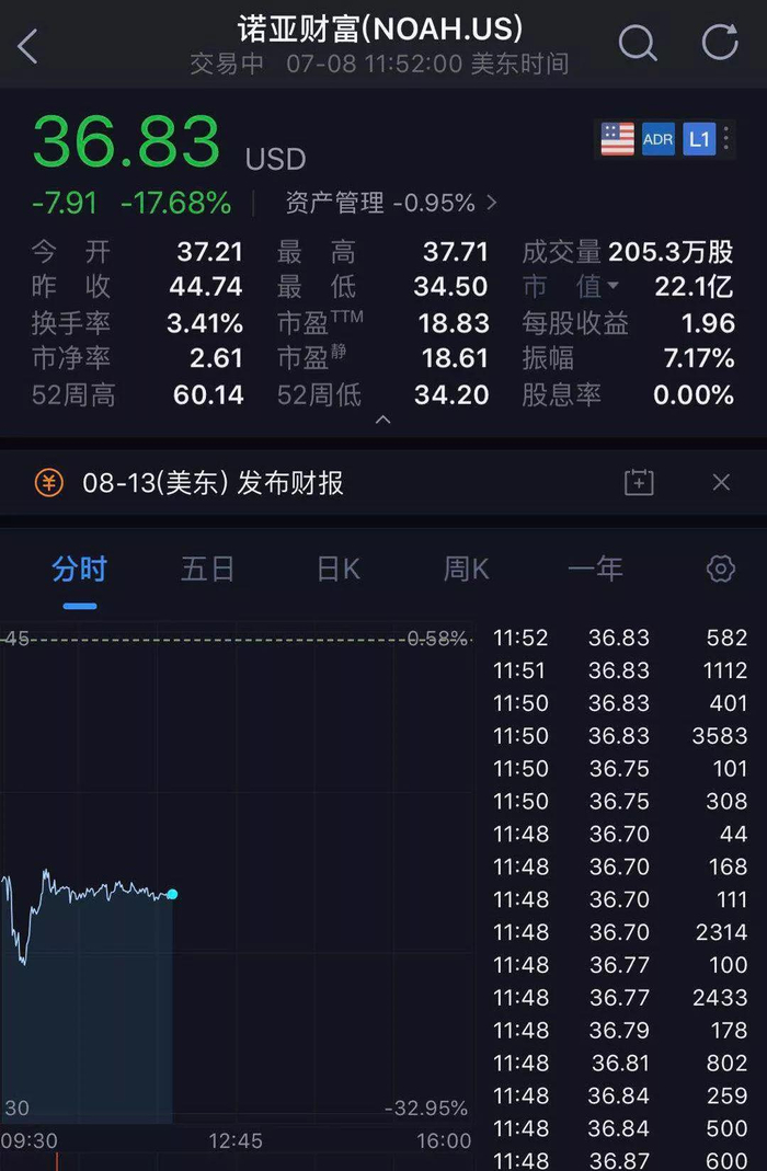 这不就是妥妥的踩雷了?于是,就有了美股诺亚财富的股价闪崩的一幕。