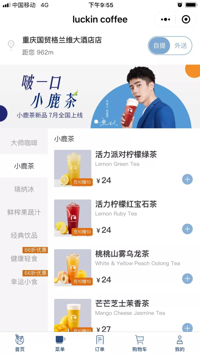 7月8日,瑞幸咖啡(luckin coffee)宣布在全国40个城市近3000家门店推出10余款小鹿茶产品,并正式邀请人气明星刘昊然全新代言,布局新茶饮市场。