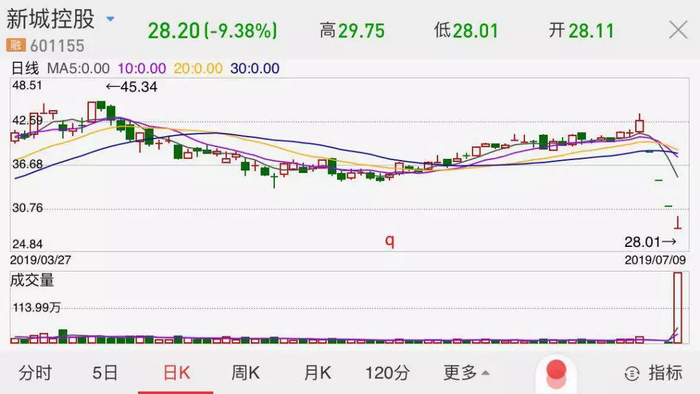 事件曝光后,新城控股连续吃下3个跌停,今天(7月9日)终于打开跌停,截至发稿跌幅为9.38%,每股报28.2元,目前总市值为636亿元,4个交易日市值蒸发320亿元。