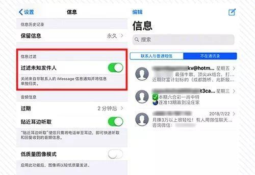 设置后,信息就会被分为两类,通过IMessage发来的垃圾短信将会被划分为“不在通讯录”一列,并且不会有短信提示音。