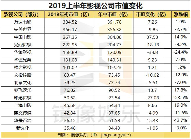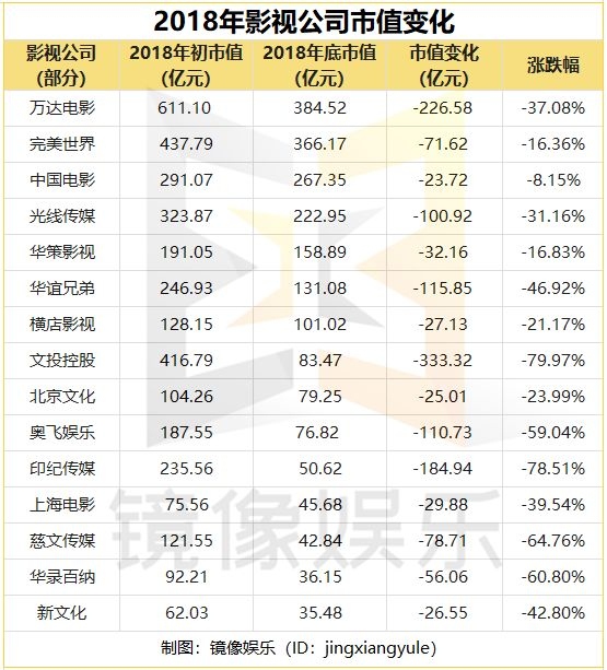 与此同时,业内新势力的涌入也在加速行业进入洗牌期,新兴影视公司的崛起在不断挤压老牌公司的空间,从镜像娱乐(ID:jingxiangyule)统计的15家上市影视公司来看,在2018年一年无一家公司市值增长,市值总蒸发超1400亿,跌幅在50%以上的公司就高达6家。