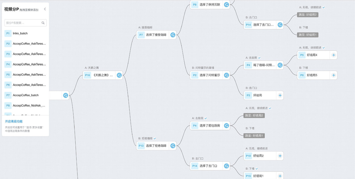 B站的互动视频更像是低配版橙光游戏,它没有橙光的素材库,分支树也无法满足UP主复杂的制作需求。但雏形已现,同样是学生居多且范围更大的受众人群,可满足UP主的幻想心理与用户代入感,拥有更多呈现方式的B站互动视频可能有更多潜力。