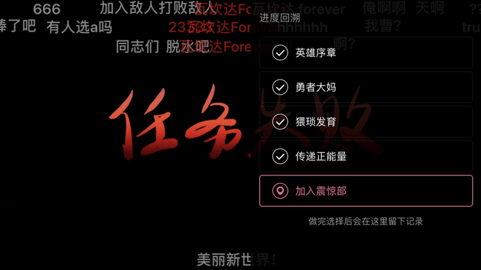 而《操控广场大妈拯救B站》中每个选项都有固定的正确答案,选择错了就只能立马 GameOver。B站采取的补救措施是在视频下方加入“剧情回溯”的功能,再来一次的时候可以选择之前的时间节点继续游戏。