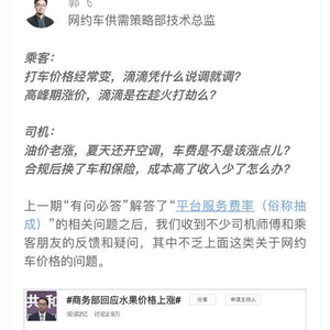 7月10日,滴滴在“有问必答”栏目回答了司机和乘客普遍关心的价格问题。滴滴网约车供需策略部技术总监郭飞实名解答了决定网约车价格变化的因素,并向公众广泛征集意见与建议。