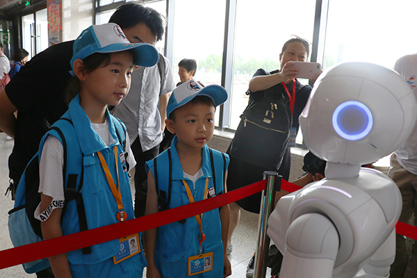 两位小朋友和机器人“小白”互动。中国网记者 卢小凡/摄