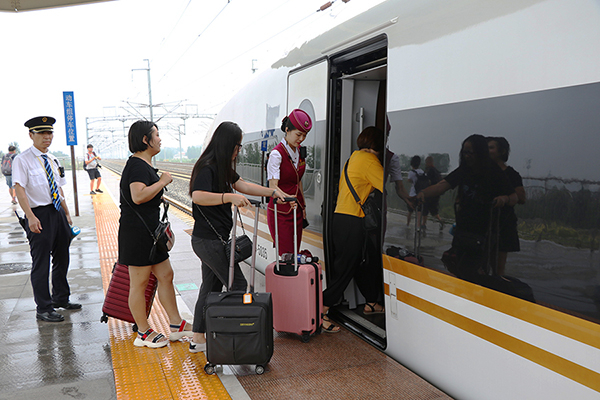 乘客在列车员的指引下有序乘车,登上G305次列车“尝鲜”。中国网记者 卢小凡/摄