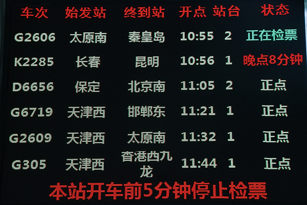 大屏幕上显示的列车时刻表。G305次列车的开通,为雄安市民的外出提供了多一种选择。中国网记者 卢小凡/摄