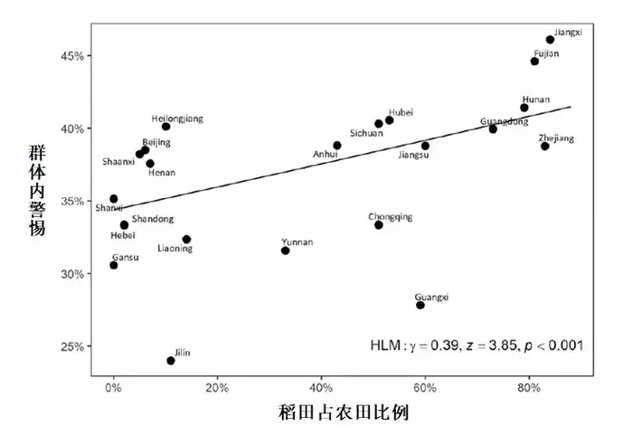 相比来自小麦种植区的人,水稻种植区的人同时具有更强的集体主义意识和更高的群体警惕性。