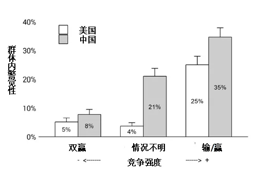 在明确的双赢情境下,中国人的群体内警惕性会显著下降;而在明确的胜负竞争情境下,美国人的群体内警惕性会显著上升。