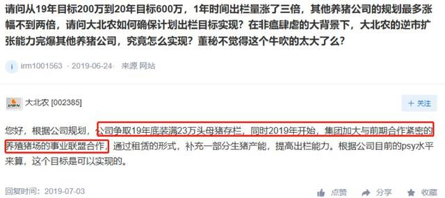 除了年报分析与一季度财务数据“打架”外,公司还在年报中表示要“抓住行业机遇,”并“加大对养猪产业的投资”。目前公司“已经具备的18.7万头母猪存栏能力“,在深交所投资者互动平台上公司则表示“争取19年底装满23万头母猪存栏”同时“加大与前期合作紧密的养殖猪场的事业联盟合作”。